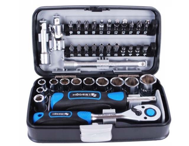 Якісний набір головок, біт і аксесуарів 1/4", що складається з 38 елементів. Набір поміщений в невеликий зручний кейс , який поміститься навіть у кишені. Набір складається з головок і аксесуарів з хромованадієвого сплаву. стійкі до деформації, ковані, храповий механізм на 72 зубці, упаковані в захисний футляр з металевими петлями.